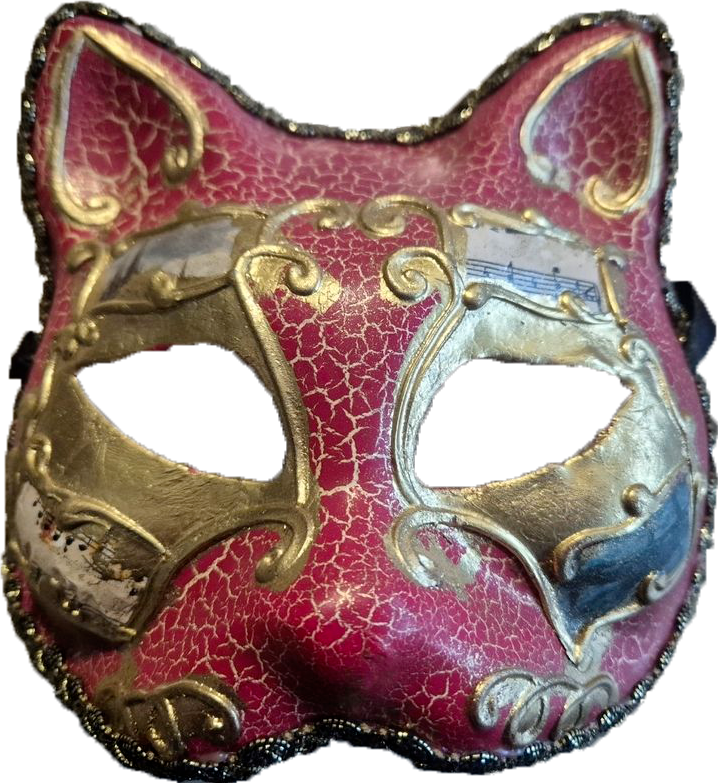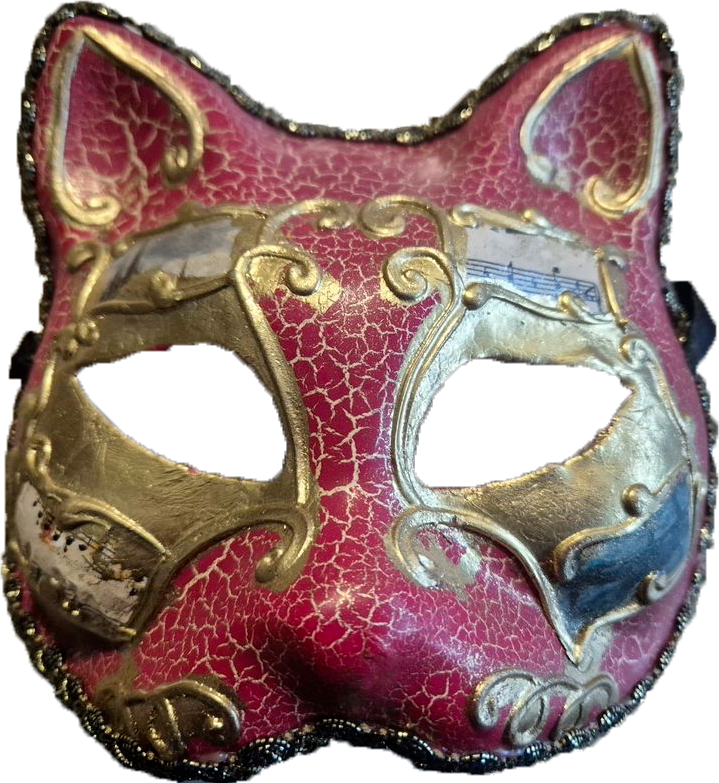 Le masque représente un chat (GATTO en italien), un animal d’une rareté précieuse à Venise. En raison de la configuration de la ville (les chats n’aiment pas l’eau) et des épidémies de peste, les chats étaient vénérés pour leur rôle de prédateurs de rats.