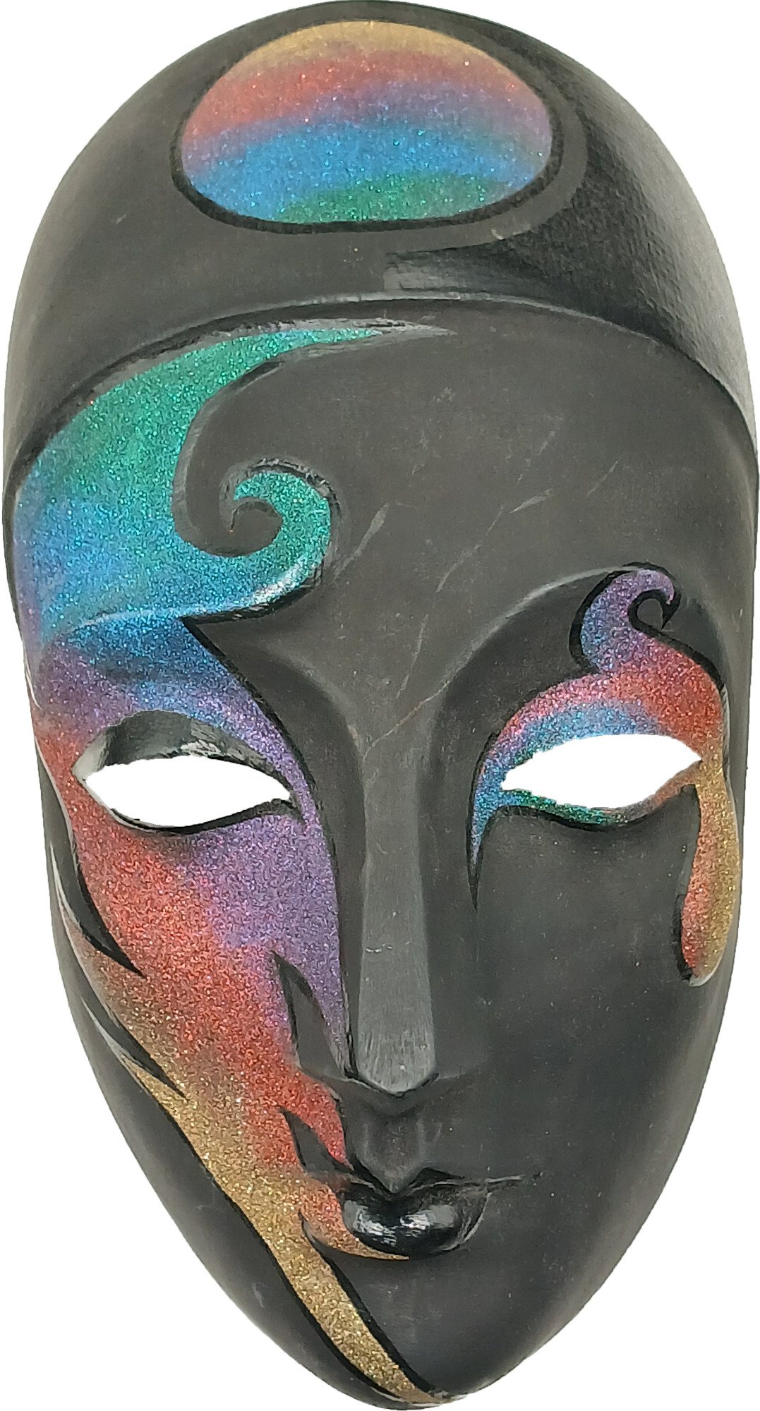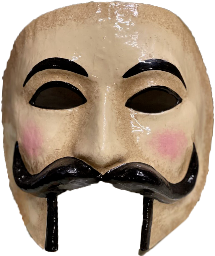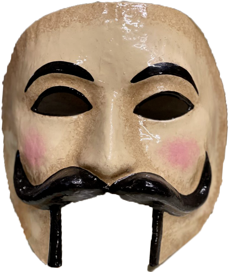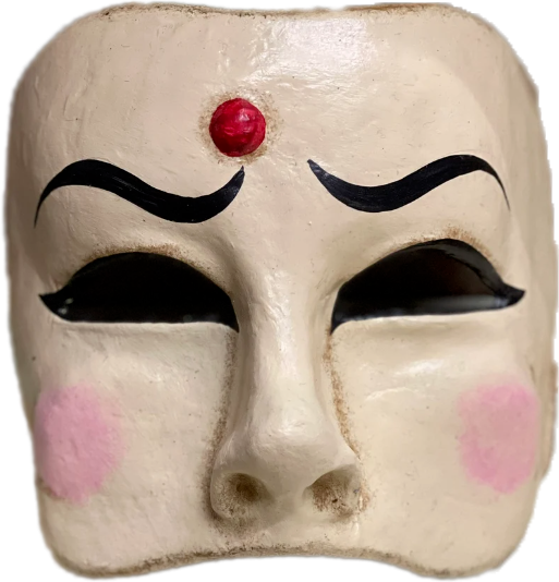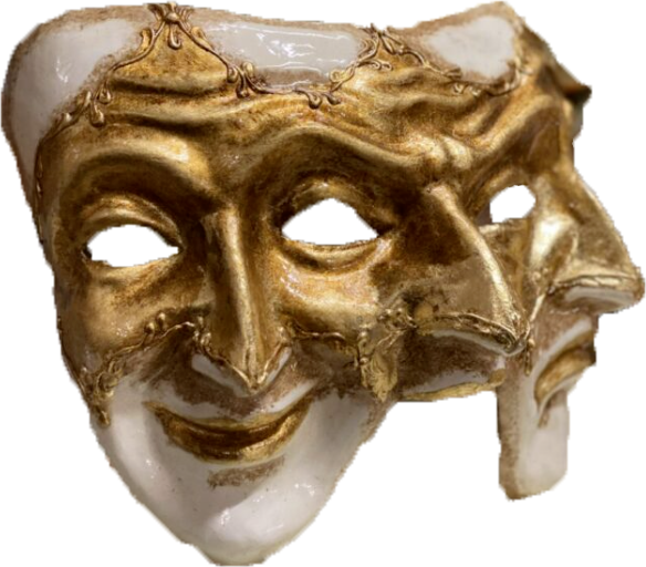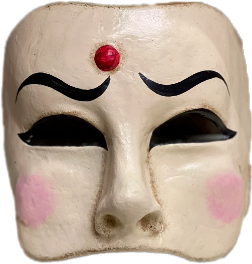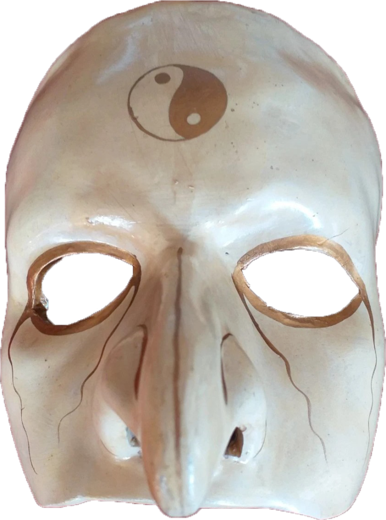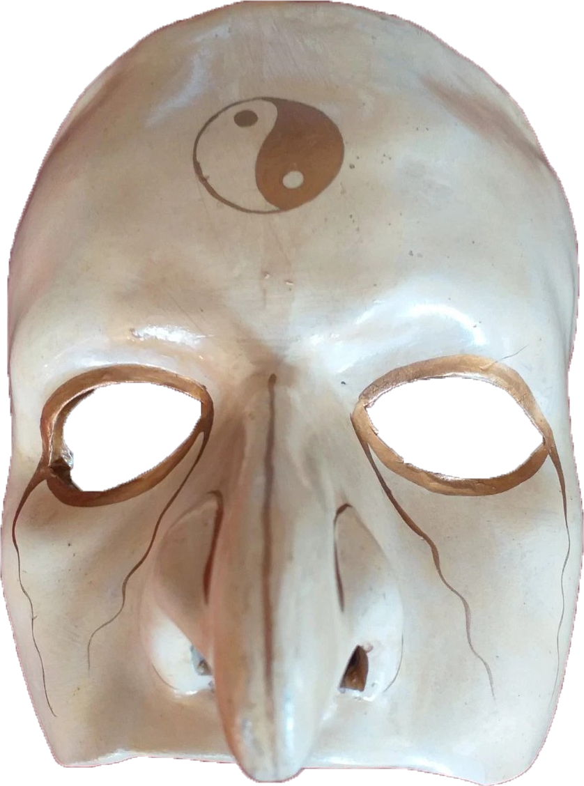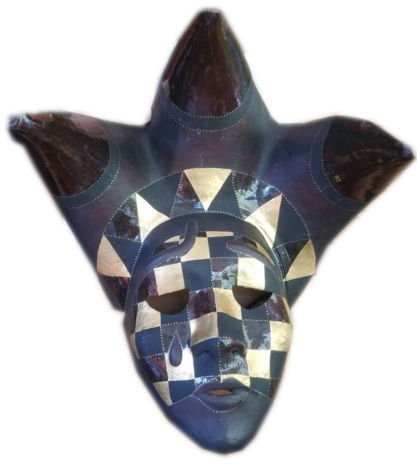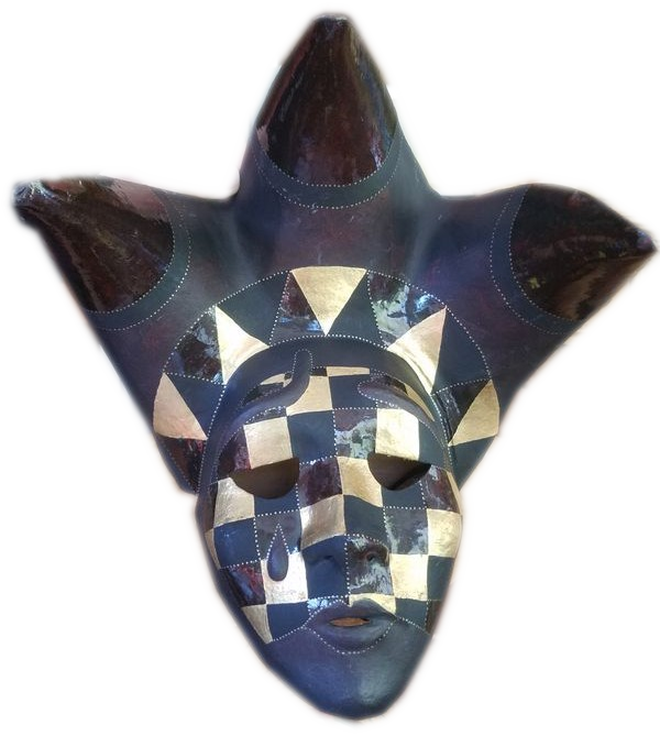 Les trois visages affichent des émotions différentes illustrant la complexité de l’âme humaine. Ce masque ambigu permet de donner l'illusion d'être partout à la fois.