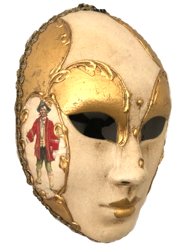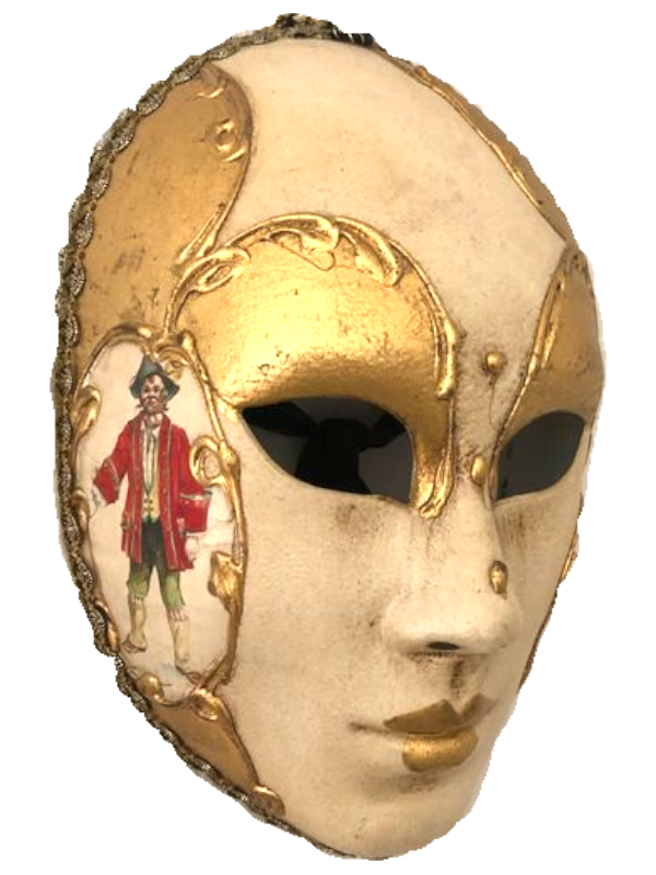 Le masque VOLTO qui signifie littéralement VISAGE en Italien, se distingue par sa simplicité. Il s’agit d’un masque d’un blanc pur, sans expression, le plus souvent androgine. Sous un Volto, un noble et un roturier étaient identiques. Il est réintroduit en 1980 et, lui aussi, se pare de dorures, arabesques et autres peintures.